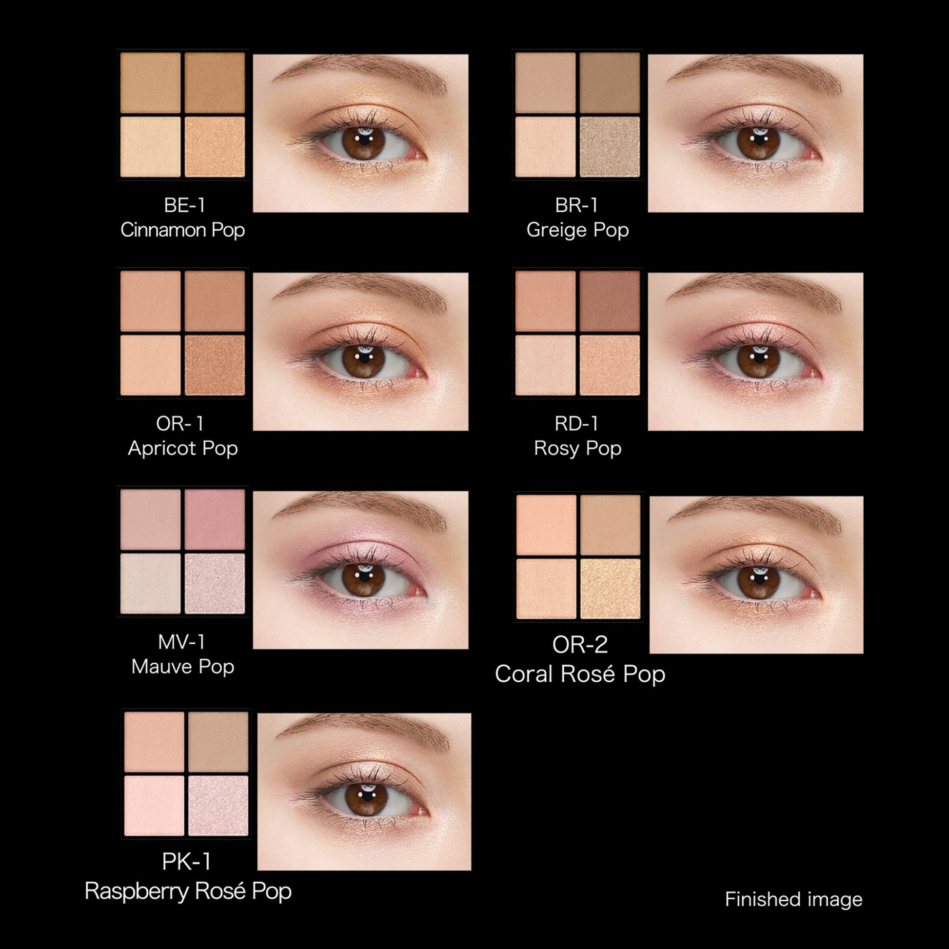 Shade lineup includes tones like BE-1 Cinnamon Pop, BR-1 Greige Pop, OR-1 Apricot Pop, RD-1 Rosy Pop, MV-1 Mauve Pop, PK-1 Raspberry Rosé Pop, OR-2 Coral Rosé Pop (availability depends on stock).