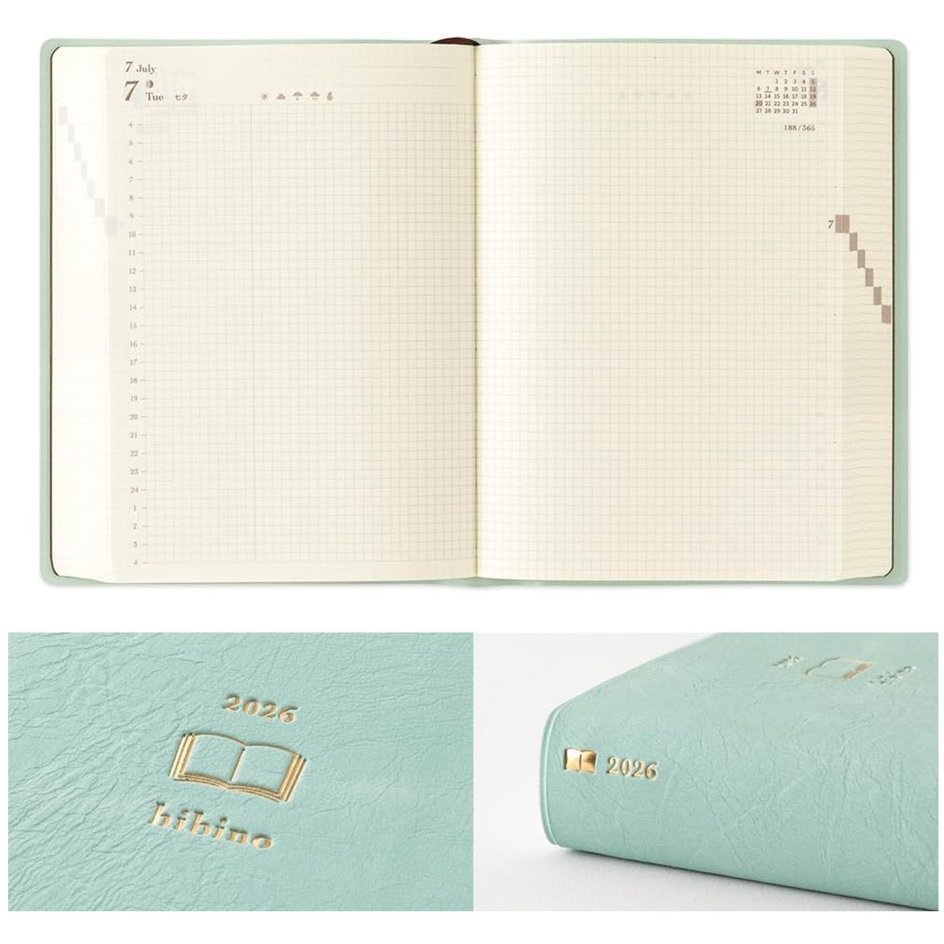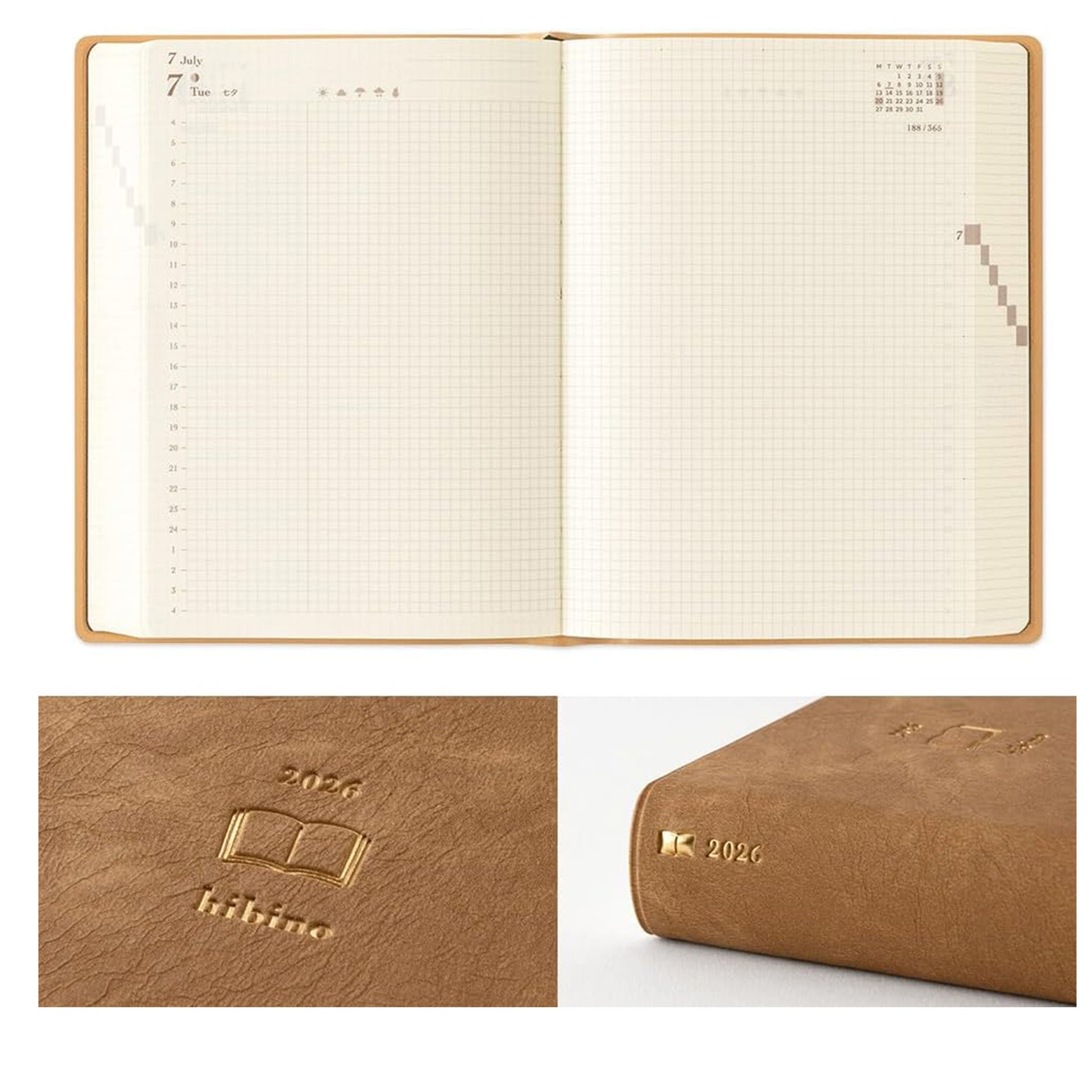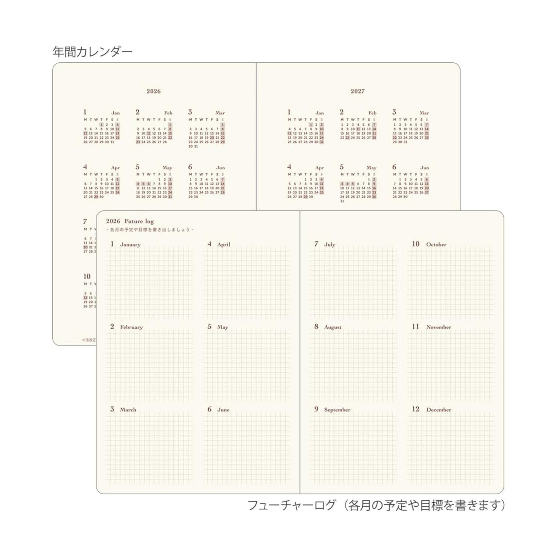 Inside, you’ll find monthly block pages from December 2025 to January 2027 (14 months) and daily pages from January to December 2026, plus a yearly calendar, future log, and memo pages. This makes Hibino ideal both for long-term planning and ultra-detailed daily journaling.