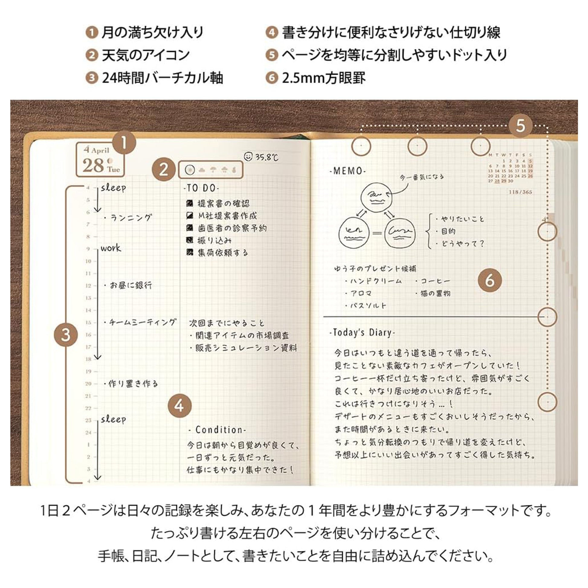 - Two ribbon bookmarks to separate your daily spread and monthly or future log